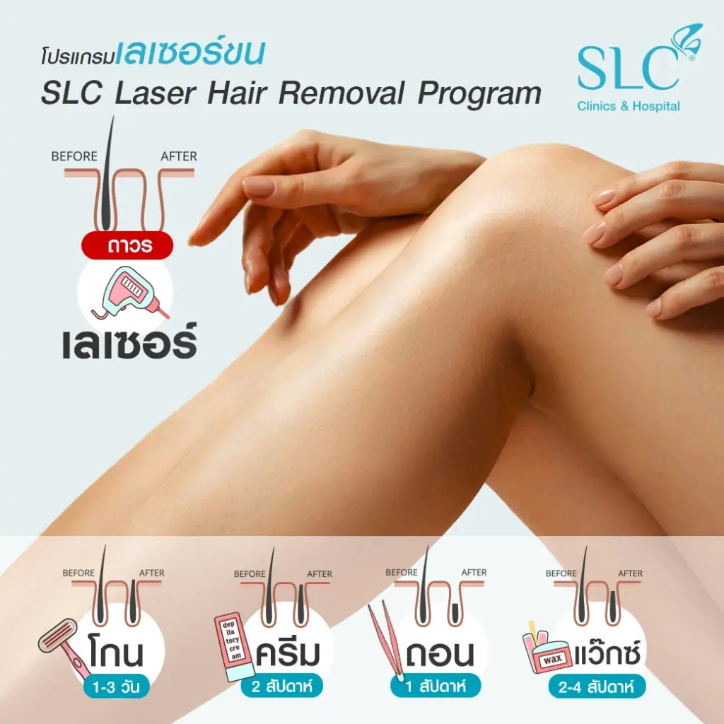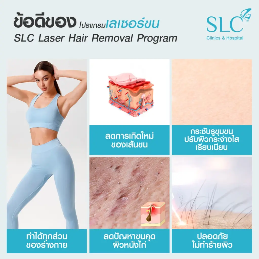 Laser Hair Removal เทคโนโลยีเลเซอร์กำจัดขนด้วย Gentle Yag Laser เป็นเทคโนโลยีการกำจัดขนที่ใช้คลื่นพลังงานความร้อนเข้าไปช่วยจับเม็ดสีของเส้นขน ที่อยู่ใต้ผิวหนังตามจุดต่างๆ เมื่อเส้นขนโดนความร้อนก็จะทำให้หยุดการเจริญเติบโต และค่อยๆ หลุดร่วงไป ซึ่งการกำจัดขนด้วยเลเซอร์เทคโนโลยีที่ใช้ใน SLC Clinic ได้แก่ Gentle YAG Laser ที่เลเซอร์กำจัดขนได้อย่างมีประสิทธิภาพ ได้ผลดี ไม่ทำร้ายผิวโดยรอบ และสามารถทำได้กับทุกสภาพผิวและเฉดสีผิว ปลอดภัยได้รับการรับรองมาตรฐานความปลอดภัย (FDA) ทั้งในประเทศและต่างประเทศ