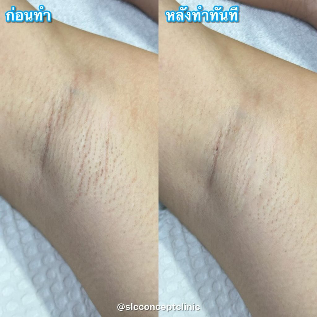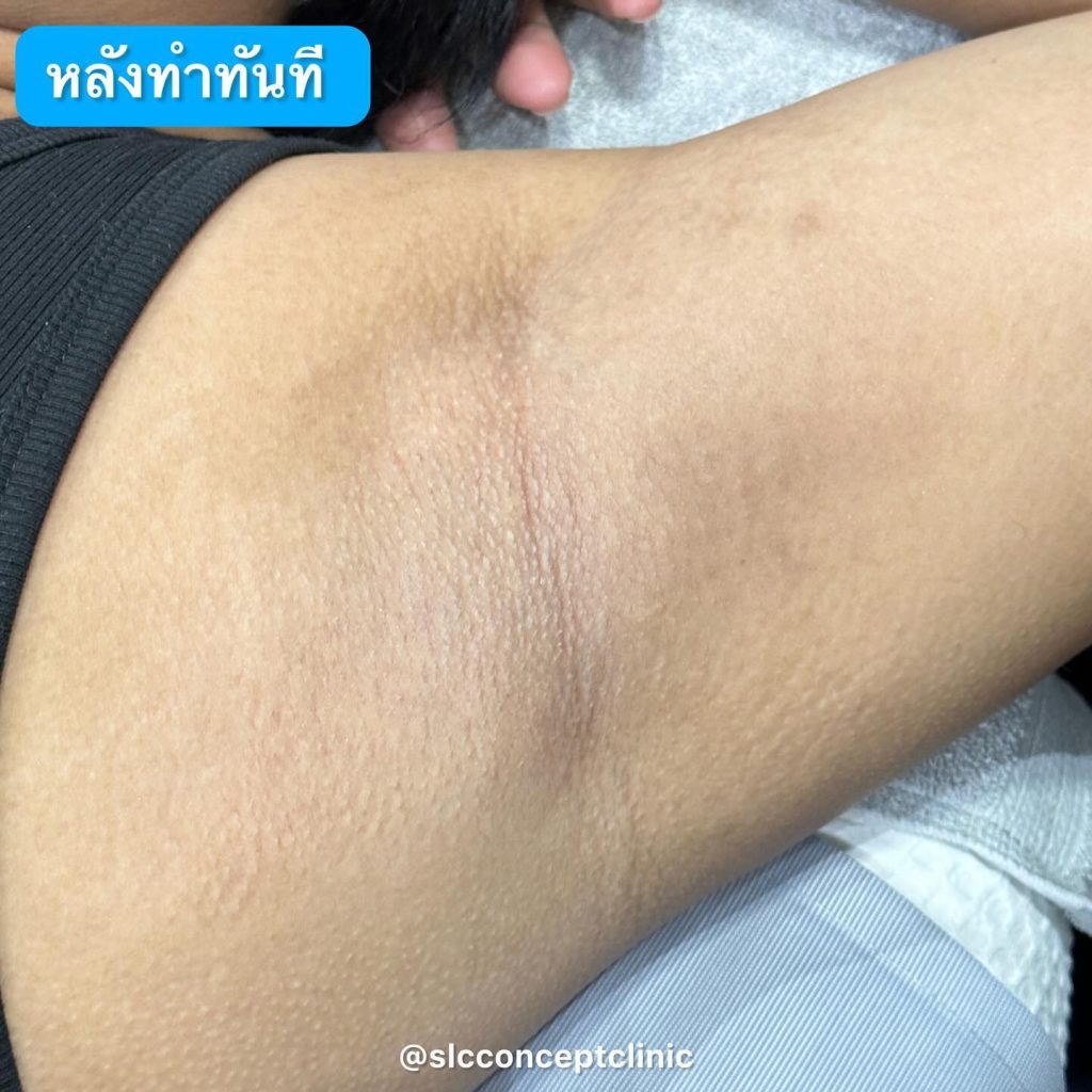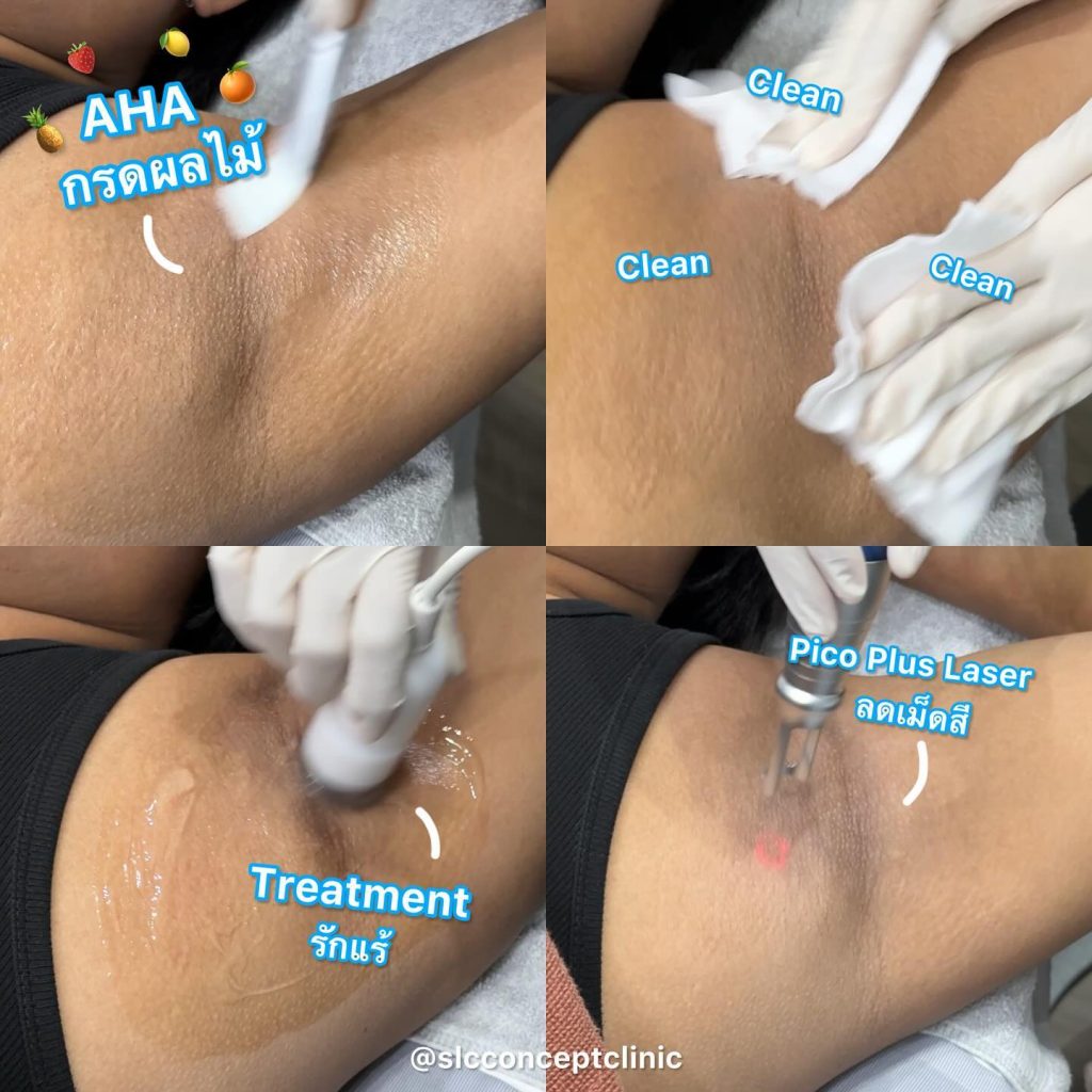 เริ่มต้นด้วยการทำทรีตเมนต์สูตรเฉพาะจาก SLC Clinic เสริมวิตามิน กรดผลไม้ AHA  สูตรอ่อนโยนที่ออกแบบมาเพื่อลดความหมองคล้ำและปรับผิวให้กระจ่างใสโดยเฉพาะ ต่อด้วยการผลักตัวยาด้วยเครื่องลงลึกถึงเซลล์ผิว  ทรีตเมนต์นี้จะช่วยบำรุงผิวชั้นลึกและผลัดเซลล์ผิวอย่างอ่อนโยน ฟื้นฟูความเรียบเนียนและความชุ่มชื้น ทำให้ผิวรักแร้ดูเนียนละเอียด ช่วยลดปัญหาความหยาบกร้านหรือรอยดำสะสม ทำให้รักแร้ดูขาวใสขึ้นอย่างเห็นได้ชัด